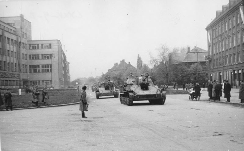 První sovětské tanky se objevily na Vítkovické ulici u jámy Šalomoun kolem 15. hodiny. Jejich příjezd byl přivítán skupinou obyvatel, z nichž někteří se připojili k osvobozujícím vojákům. Spolu s nimi pak postupovali do středu města, kde pomáhali vyhledávat německé vojáky a civilisty, kteří se nehodlali vzdát.